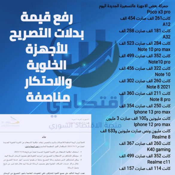 و ارتفعت اسعار جمركة الموبايلات العاملة على شبكتي الخليوي السورية ( سيرتيل/mtn) للأجهزة الجديدة بنسبة تتراوح بين ٢٠_ ٣٠% ، وقد حصل أعلى معدل قيمة تصريح عن جهاز “Iphone 12 pro max” هي في القائمة الحالية لتصبح ٣ مليون ليرة بدل مليونان ومئة الف ليرة أي ارتفع من ٦٠٠ دولار الى ٨٥٨ دولار، وهو ما يعادل ثمن جهاز جديد خارج سورية!.