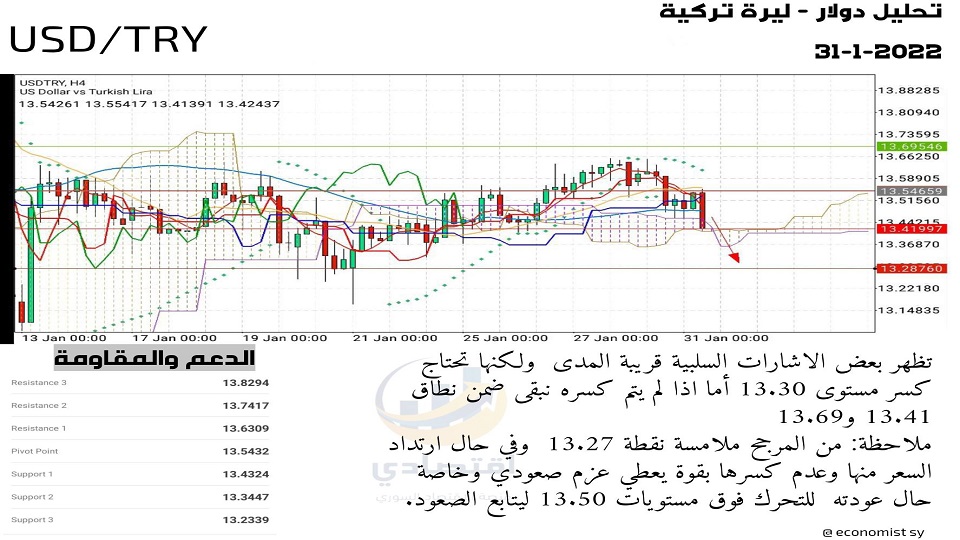 تظهر بعض الاشارات السلبية قريبة المدى ولكنها تحتاج كسر مستوى 13.30، أما اذا لم يتم كسره نبقى ضمن نطاق 13.41 و13.69 .