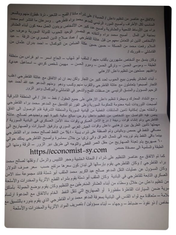 هذه الوثيقة تبدأ بسرد الاحداث ، كيف استطاعت عائلة القاطرجي بناء ثروتها بالاستناد على علاقاتهم مع داعش ومع شمال العراق ومع تركيا ولبنان.