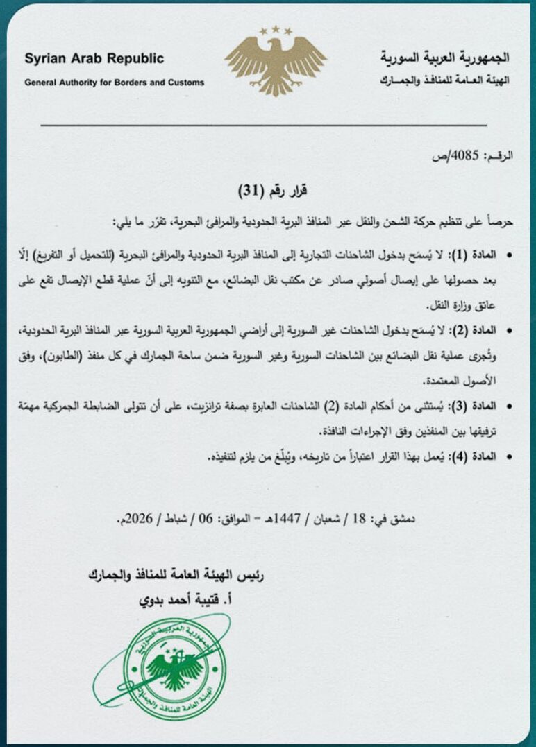 صدور القرار دون إشراك أصحاب المصالح الأساسيين في أي مشاورات مسبقة، سواء غرف الصناعة والتجارة، أو وزارة النقل، أو الجمعية السورية للشحن والإمداد الوطني.